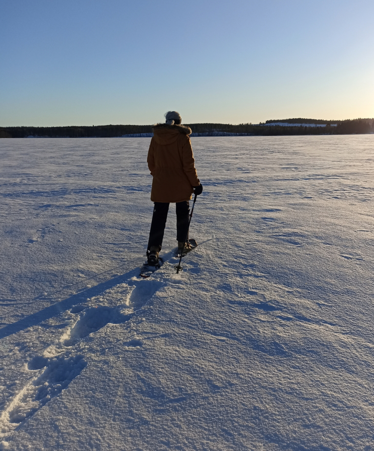 Die absolute Stille der Winterwelt in Schwedisch Lappland kann man bei einer Wanderung durch tiefen Schnee im Wald oder über den See zu kleinen Inseln erleben.